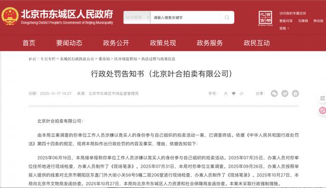 北京市东城区市场监督管理局在行政处罚告知书中透露,2025年6月19日,该局接到举报称北京叶合拍卖有限公司工作人员涉嫌以竞买人的身份参与自己组织的拍卖活动。2025年7月25日,办案人员对该公司住所地进行现场检查,并制作了《现场笔录》。2025年7月31日,该局立案调查。2025年9月26日,办案人员按照举报人提供的线索再次进行现场检查,并制作了《现场笔录》。其后该局分别向北京市文物局和北京市东城区人力资源和社会保障局发函协查。本案未采取行政强制措施。