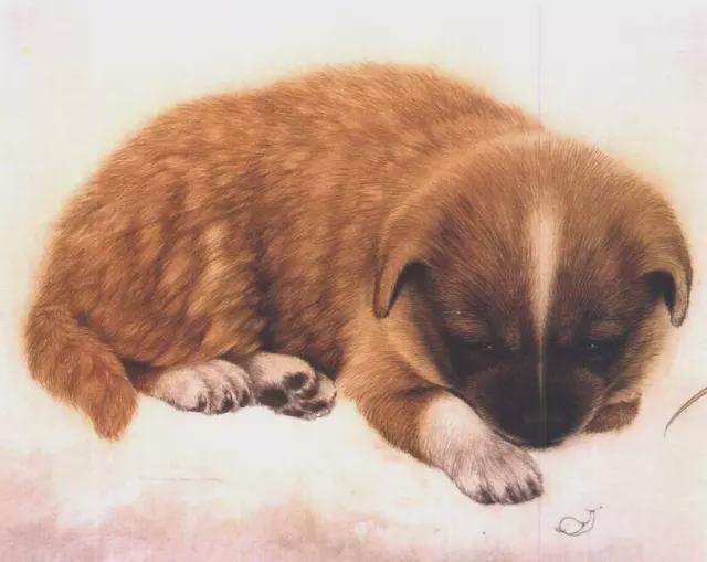 (2)第二遍丝毛,用比第一遍较深的色继续深入刻画,不断加深,直至皮毛有厚重感。这幅画的小狗毛的特点是细而毛绒,故在丝毛时毛应留出块状,注意毛的虚实处理,白毛处丝以淡色(赭石加墨)。