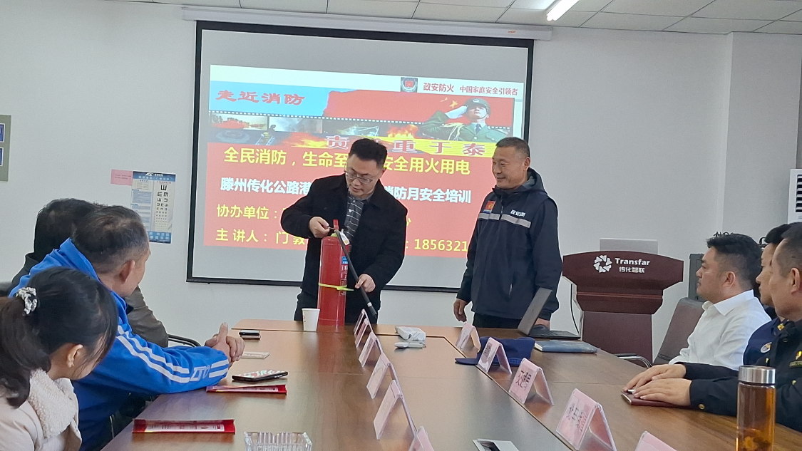 活动于上午9时30分在613会议室正式启动。首先鲁西片区总经理、滕州公路港总经理杨龙致辞,他表示消防安全是园区运营的生命线,滕州传化公路港将始终坚守安全底线,持续完善消防防控体系,希望通过此次活动凝聚多方力量,共建园区消防安全“防火墙”。随后北辛街道王艳波主任对活动举办表示肯定,他指出物流园区是消防安全重点区域,北辛街道将全力支持政企联动,推动消防安全管理常态化,也呼吁参会人员学习消防技能,共同守护辖区安全。最后特邀正安消防讲师围绕火灾预防、器材使用、逃生急救等核心内容,结合物流仓储、车辆充电等场景的典型案例,用通俗语言讲解安全隐患排查要点,提升参会人员应急逃生处置能力。