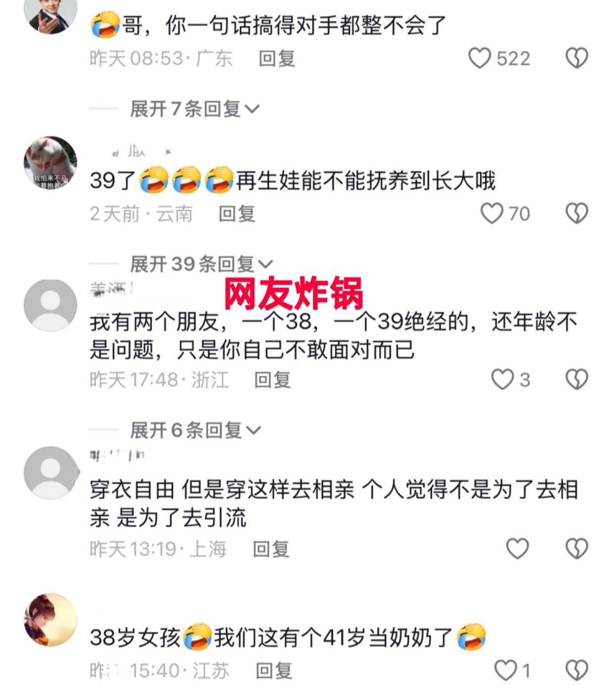 有些女网友都觉得39岁确实过大:“38岁的女孩?听着就违和!我们这里,一个41岁都当奶奶了!38岁结婚生娃,能把娃养大吗?”