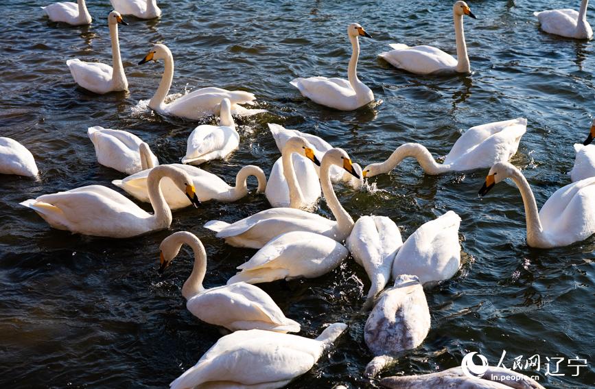 在辽宁省朝阳市北票市南八家子乡红村天鹅湾,数百只洁白天鹅游荡觅食。人民网记者 邱宇哲摄