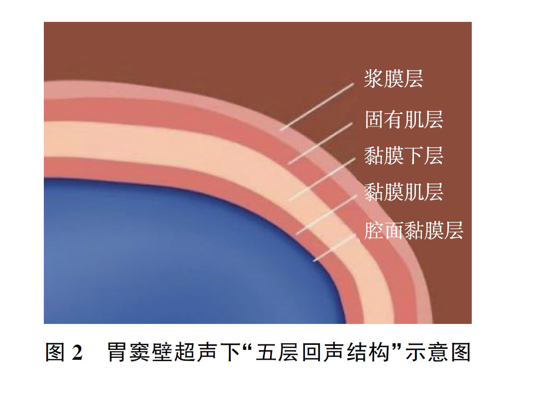 高频线阵探头下,正常胃窦壁呈典型的“五层回声结构”[5](图2),由内至外依次为,腔面黏膜层:最内层明亮线状高回声;黏膜肌层:呈均匀低回声;黏膜下层:形成特征性高回声带;固有肌层:为较厚的均质低回声层;浆膜层:显示为连续高回声线。