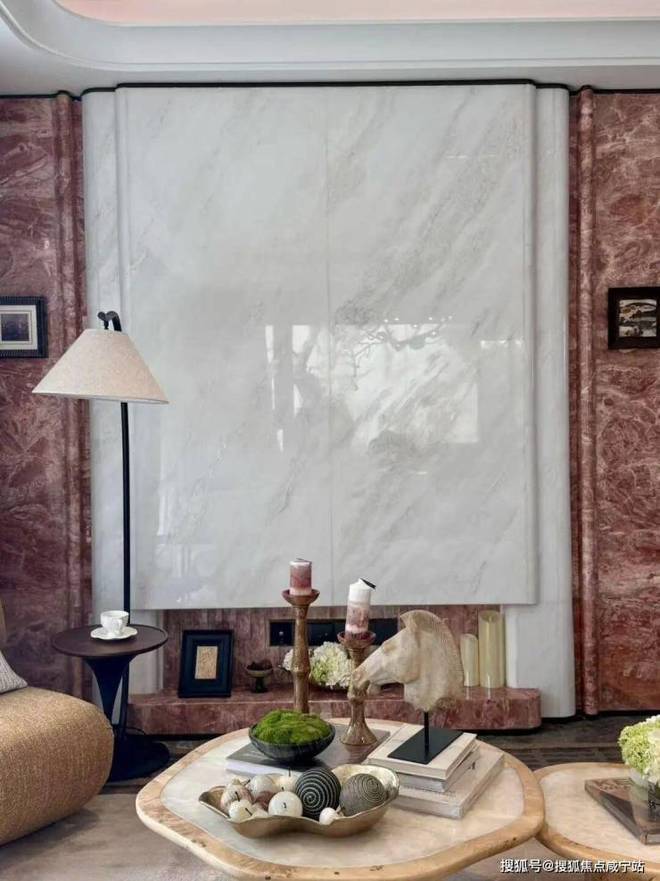 金海雲墅售楼处电话:400-886-2002【预约☎】电视背景墙堪称视觉焦点,安妮白玉大理石搭配意大利米兰红大理石,白色基底交织精致灰纹,红色底色映衬独特纹理,每一块石材都是天然的艺术画作,老钱气质瞬间拉满。