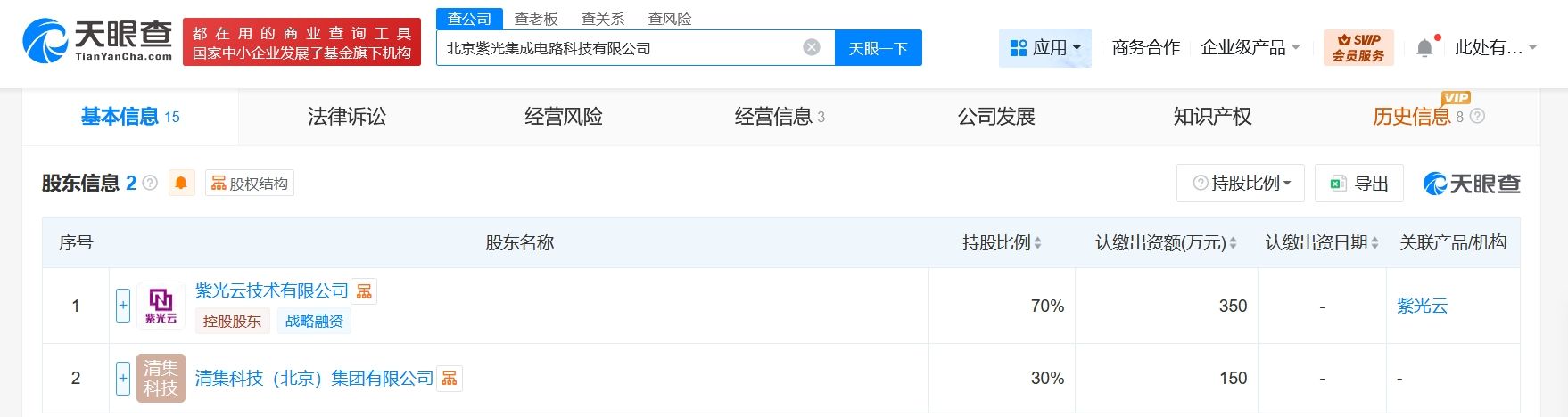 天眼查工商信息显示,近日,北京紫光集成电路科技有限公司成立,法定代表人为王燕平,注册资本500万人民币,经营范围含云计算设备销售、计算机软硬件及辅助设备批发、计算机软硬件及辅助设备零售、电子产品销售、仪器仪表销售、智能仪器仪表销售、通讯设备销售、信息系统集成服务等。股东信息显示,该公司由紫光云技术有限公司、清集科技(北京)集团有限公司分别持股70%、30%。