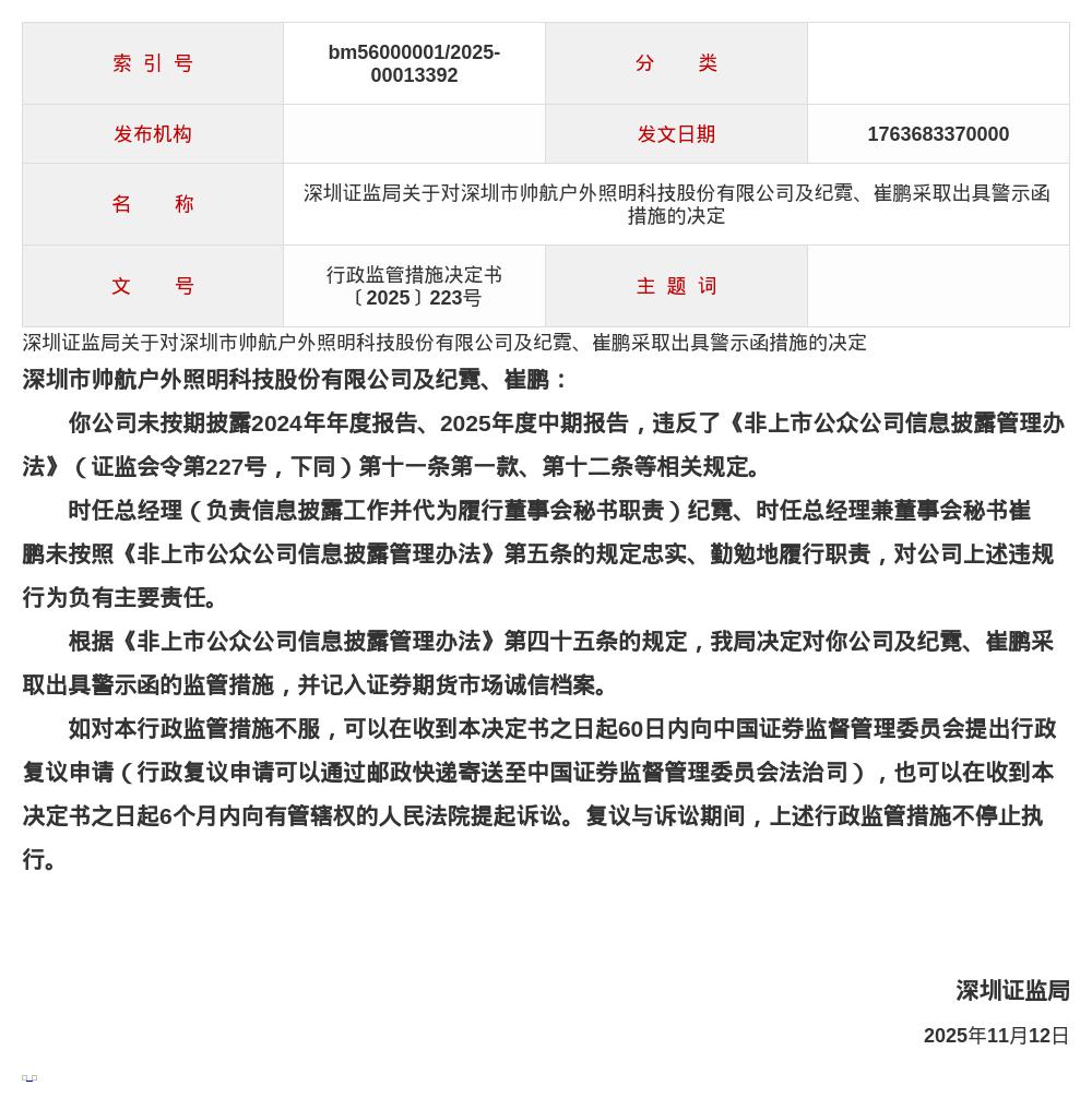 深圳帅航户外照明科技被出具警示函,涉未按期披露年报等