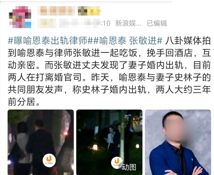 喻恩泰也疑似婚内出轨一名女律师。