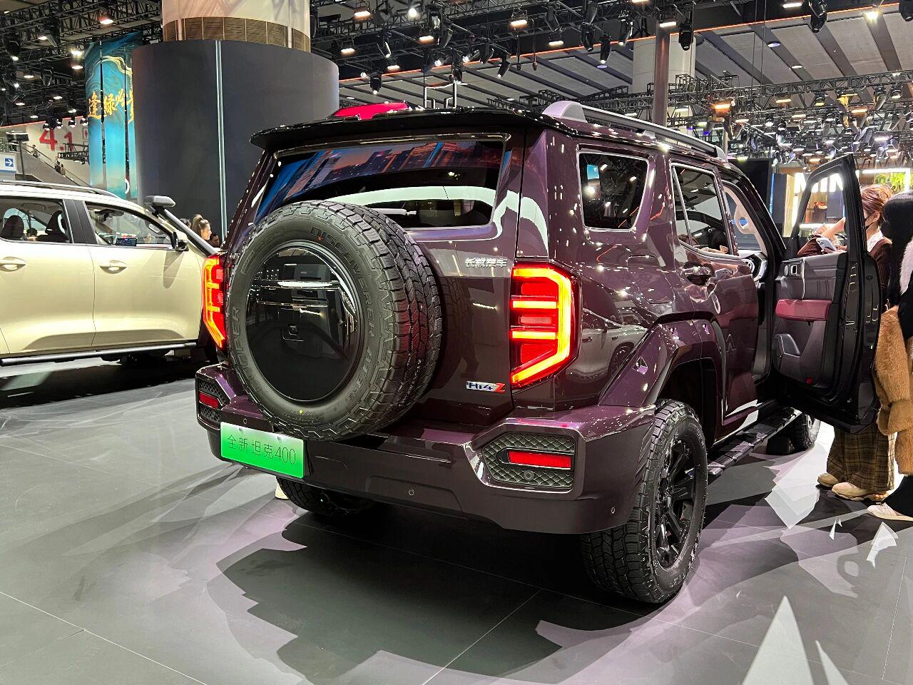 坦克 400外观采用 “0 曲线机甲” 设计,棱角分明如未来战车,专属敦煌紫配色灵感源自莫高窟壁画,搭配分体式大灯与外挂备胎,硬派又吸睛,车身尺寸 4964mm×1960mm×1905mm,气场十足。
