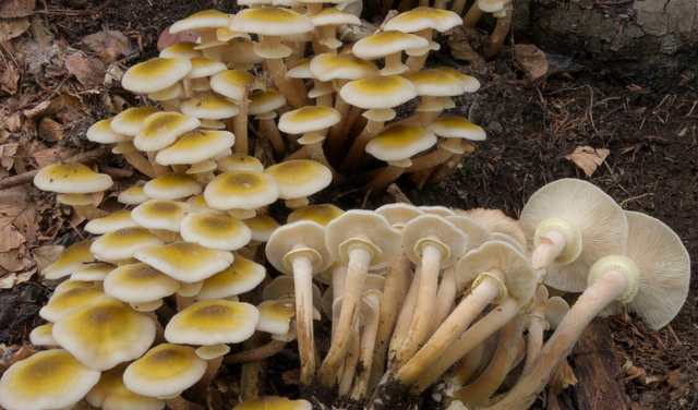 蜜环菌广泛分布于北半球温带地区,是蜜环菌属的一种担子菌,它们是一种植物病原菌,被感染的树木的基部会长出菌菇,然后树木的树冠会出现叶片变色、生长减缓、枝条枯死等症状。