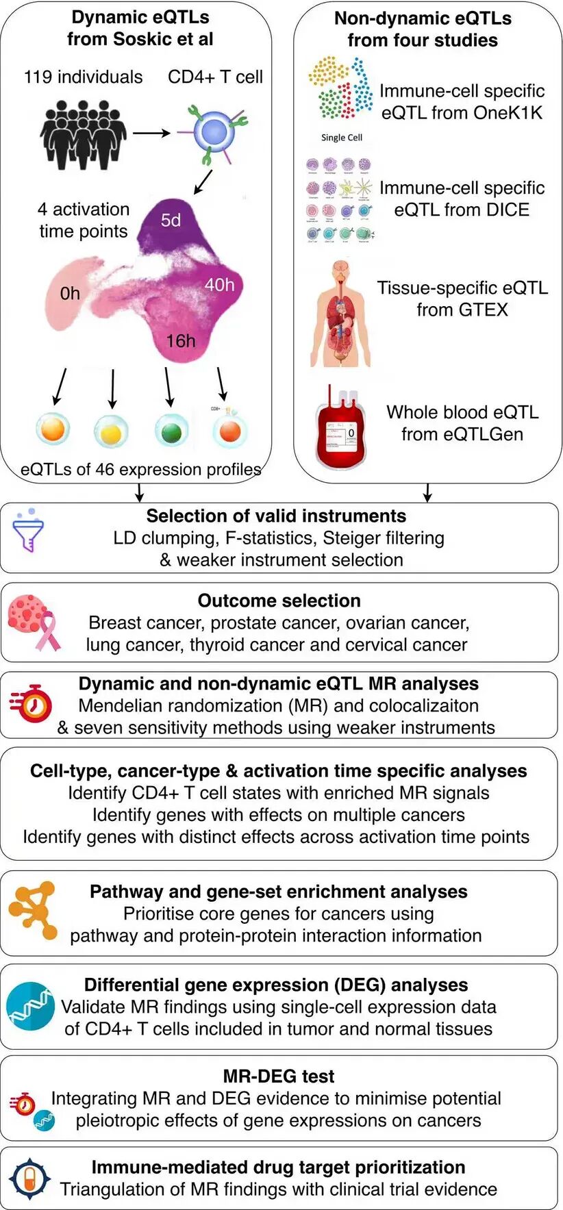 近日,瑞金医院内分泌代谢病学科郑捷教授团队利用CD4+ T细胞激活过程中的动态基因表达数据,结合孟德尔随机化(MR)和差异基因表达(DEG) 分析,减少多效性偏倚,筛选具有潜在因果效应的癌症免疫药物靶点,在Advanced Science上发表了文章Integrating Single-Cell Transcriptome-Wide Mendelian Randomization and Differentially Expressed Gene Analyses to Prioritize Dynamic Immune-Related Drug Targets for Cancers。