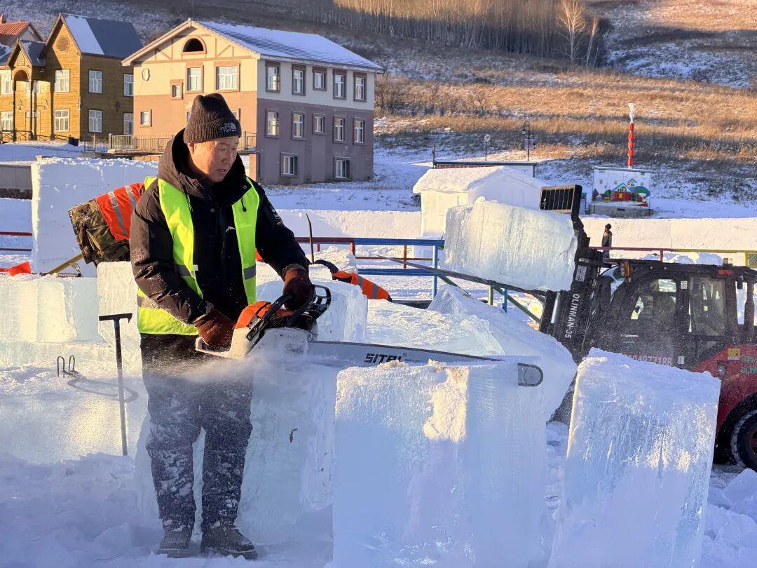 施工现场,一块块晶莹冰块在工人的调度下精准就位,冰屋的地基已初步成型,在冬日阳光下折射出湛蓝光芒。一旁的冰滑梯,目前已完成了主体框架的搭建,后续的冰块砌筑工程静候启动。施工团队以冰为材,创意施艺。冰屋采用模块化搭建,预留观景窗与休憩区,未来将融合餐饮服务与打卡互动。冰滑梯则设计多段坡度衔接,总长预计达500米,将与周边雪雕群联动,形成沉浸式游乐体验区。