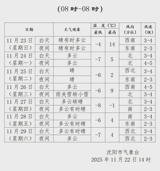 沈阳未来一周天气预报