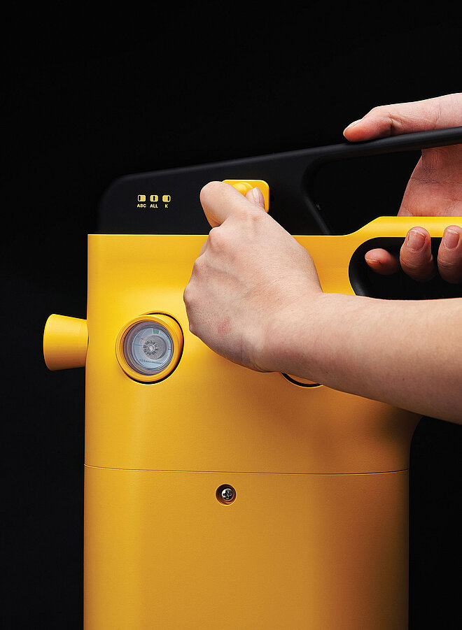 标准灭火器可能对某些火灾无效,例如食用油过热引起的厨房火灾。为了解决这个问题,我们开发了一种创新的灭火器,在一个单元中将两个容器用于不同的药剂。它结合了用于一般火灾的 ABC 粉末和用于厨房火灾的液体剂,通过单个杠杆实现更快、更高效的扑灭。