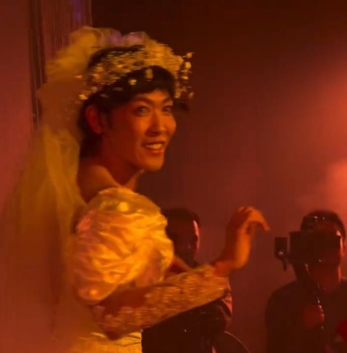 他身着白色婚纱与一只公鸡完成拜堂仪式,昏暗灯光下全程唱着自己的新歌《怪诞婚礼》,到场宾客直呼“像参加了一场奇怪的仪式”。