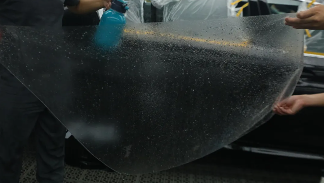 刮水施工,隐形车衣是自带胶层的。水刮出去后,膜就可以自动黏贴在车漆表面