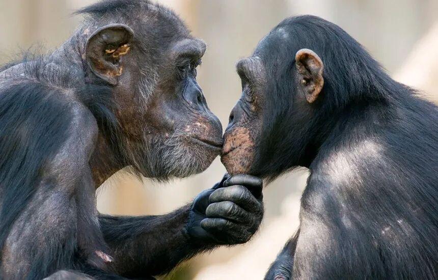 在黑猩猩和倭黑猩猩中,嘴对嘴接触常常用于缓和冲突,是“我们别吵了”的社交信号;