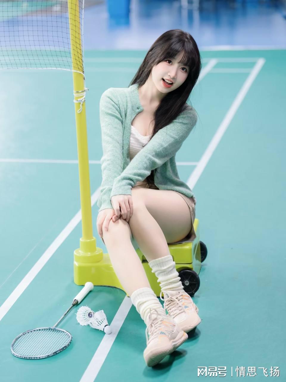 穿搭方面,她身着浅绿色的软糯针织开衫,里面是白色背心,下身则是卡其色短裤搭配厚袜和运动鞋,整体风格清爽、舒适又很运动系,非常符合羽毛球场的轻松氛围。