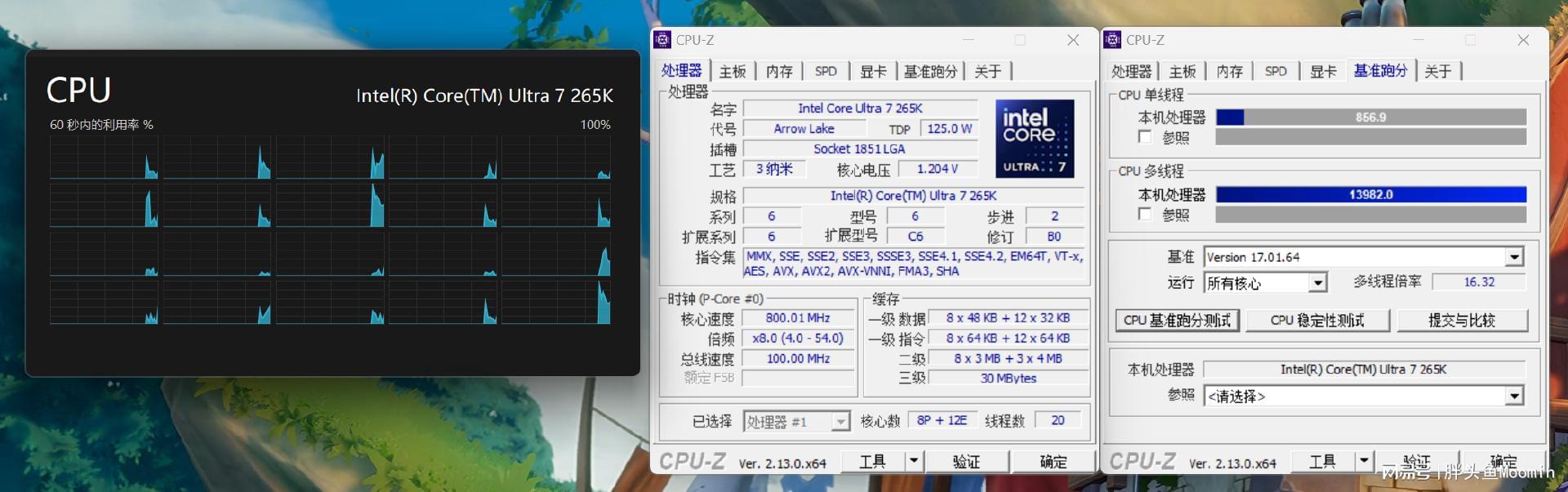 实测Intel 酷睿Ultra 7 265K处理器单核得分856,多核得分13982分。