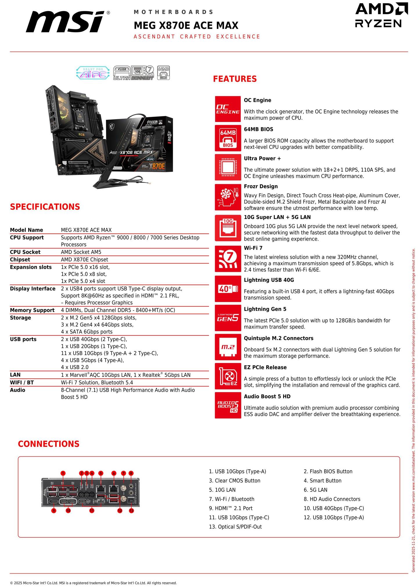 MEG X870E ACE MAX 搭载 18+2+1 相 SPS DrMOS 供电系统,拥有 4 条 DDR5 UDIMM 内存插槽,支持 8400+ MT/s 内存超频。