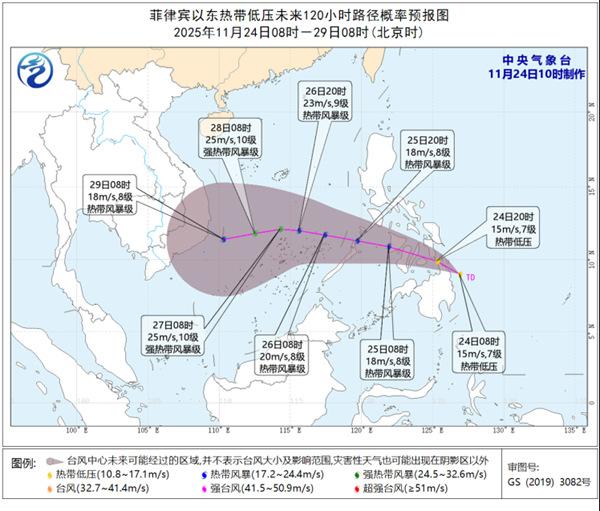 预计,该低压将以每小时15~20公里的速度向西偏北方向移动,可能于未来24小时内加强为今年第27号台风,并于25日夜间进入南海南部海域,强度缓慢加强,最强可达强热带风暴级(25~28米/秒,10级)。