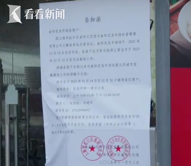 上午十点,看看新闻Knews记者来到曲阳花鸟市场看到,市场入口处的门头标识已被拆除,一旁醒目位置张贴着“即将停止营业”的告知函。不少市民闻讯而来,专程与“老朋友”告别。