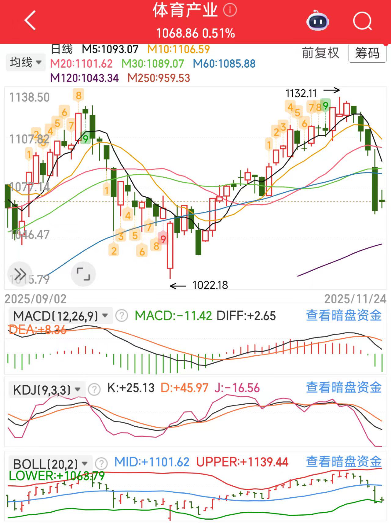 ·体育产业:体育产业指数走势略显纠结,日线均线如交织的蛛网,多空双方势均力敌,短期方向不明;MACD指标绿柱缩短但未翻红,KDJ处于中位徘徊,市场仿佛陷入胶着战;布林带上下轨开口较大,指数紧贴下轨波动,暗示突破方向亟待确认。技术面整体呈现震荡格局,需紧盯关键点位变化。