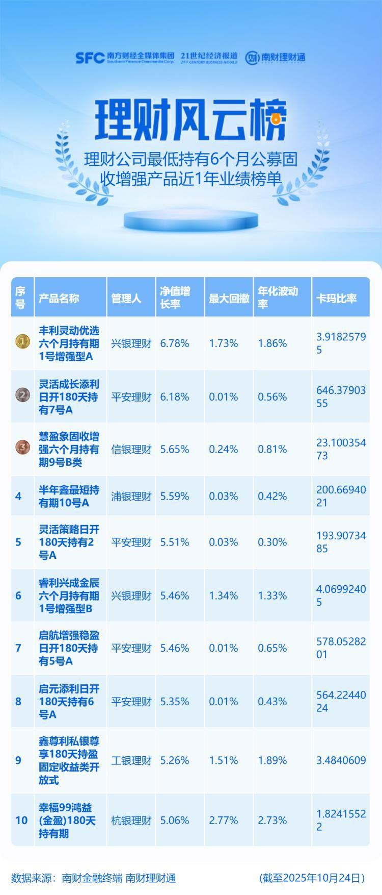 榜单数据说明:统计对象为理财公司发行的6个月持有期的公募固收增强产品,同系列同投资周期产品保留一只,统计区间为近1年,截至时间为2025年10月24日。榜单排名由理财通AI全自动化实时排名,如您对数据有疑问,请在文末联系助理进一步核实。