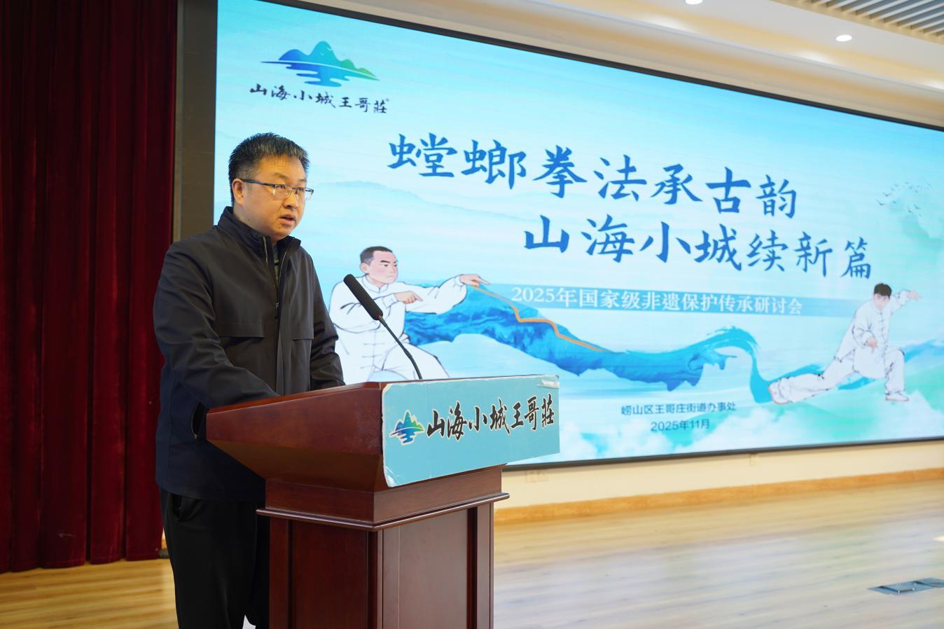 螳螂拳,源自崂山,成于胶东,与华严寺有着深厚的历史渊源,不仅是珍贵的非物质文化遗产,更是中华传统体育项目中的一颗璀璨明珠。在充分交流与展示的基础上,王哥庄街道党工委宣传统战委员郑磊先系统回顾了街道在构建“体系化保护、活态化传承、融合化发展”工作格局中取得的扎实成果。