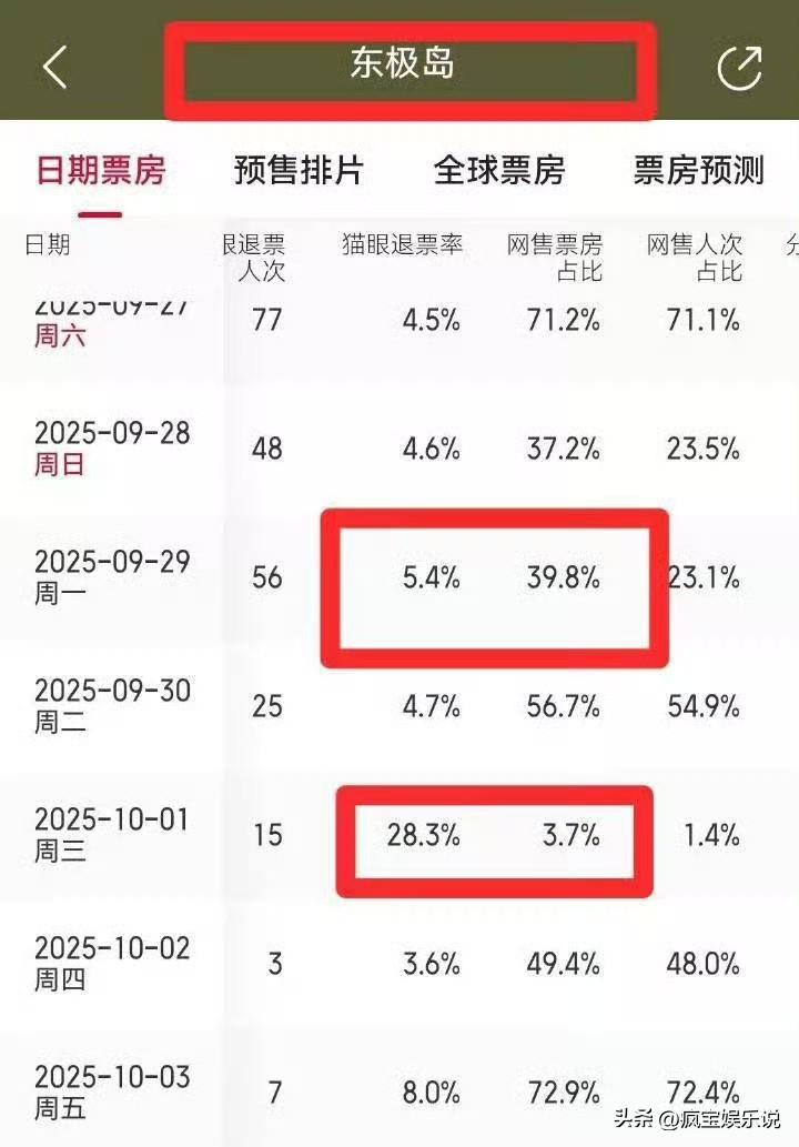 所以最后导致的结果就是,把朱一龙同年上映的《东极岛》的数据搬了出来,同样也是网售占比低,退票率高。