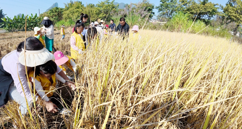 11月22日星期六,在贺州市平桂区黄田镇长寿谷农场,一阵童稚的欢笑声在田野里响起,一群孩子深一脚浅一脚地踩在田埂上,开启了他们的“稻田研学”之旅。