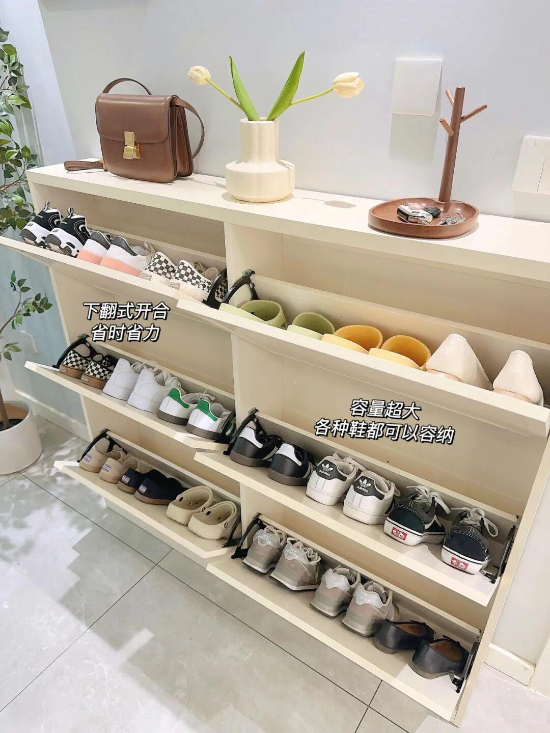 或者网购一个奶油风超薄鞋柜,深度只有18~25cm,却能放下一家人的鞋子。