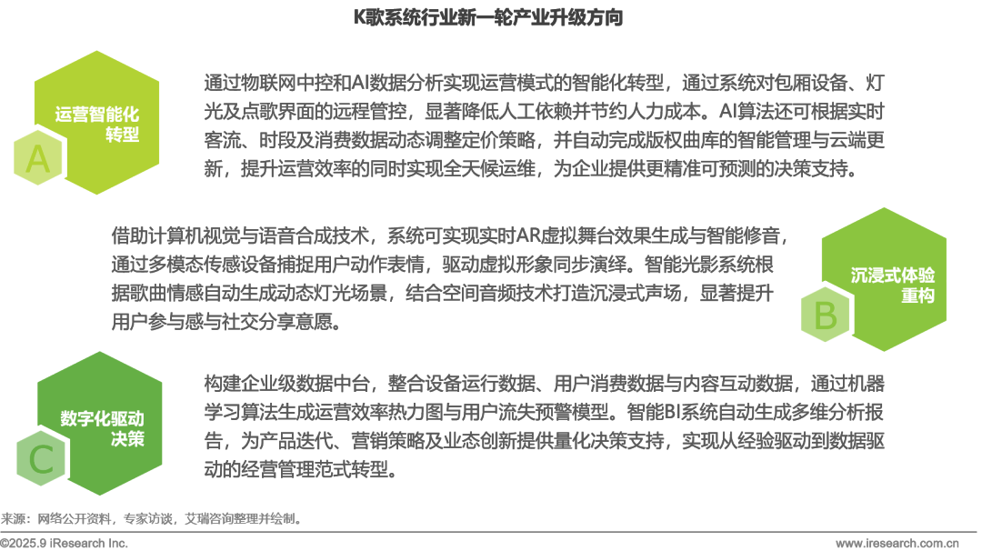 在图形计算与人工智能技术跨越式发展的驱动下,K歌系统行业正迎来以数字化与AI深度融合为核心的新一轮产业升级,具体表现为运营智能化转型、沉浸式体验重构以及数字化驱动决策三大方向。随着相关新技术在K歌系统中的应用进一步深化,将共同推动行业向更智能、高效和体验导向的未来持续演进。