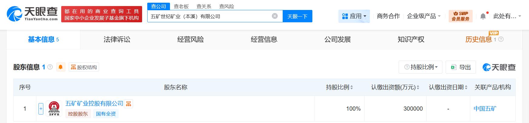 雷达财经讯,天眼查工商信息显示,近日,五矿世纪矿业(本溪)有限公司成立,法定代表人为刘增社,注册资本30亿人民币,经营范围含非煤矿山矿产资源开采、金属与非金属矿产资源地质勘探、矿产资源勘查、选矿、金属矿石销售、非金属矿及制品销售、矿山机械销售、金属制品销售等。股东信息显示,该公司由中国五矿集团旗下五矿矿业控股有限公司全资持股。
