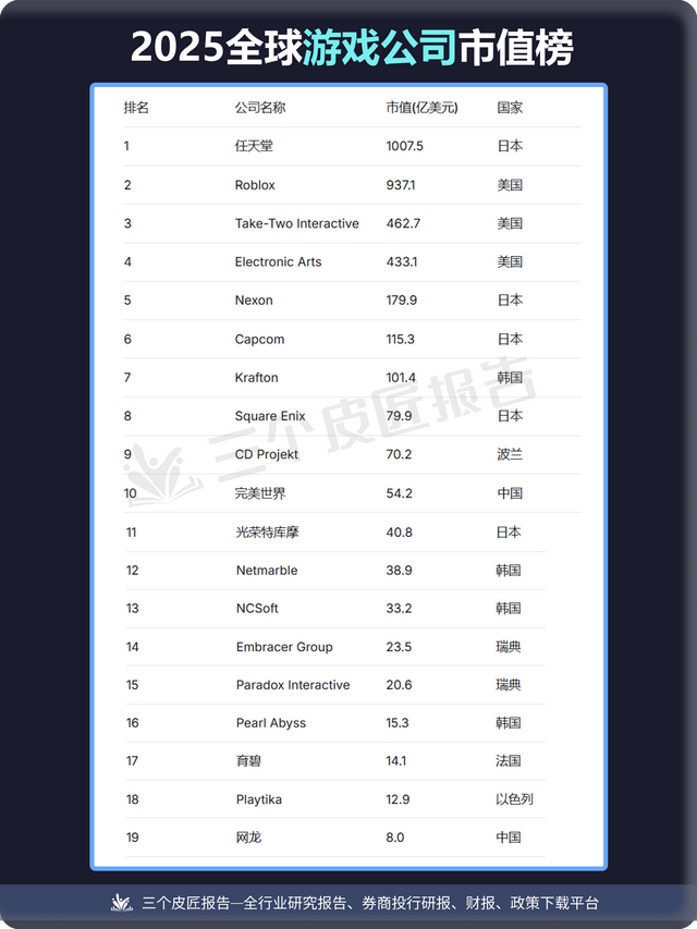 任天堂以 1007.5亿 美元市值稳居榜首,其经典IP库(马里奥、塞尔达等)与硬件生态构筑了深厚护城河。Roblox以 937.1亿 美元紧随其后,其“元宇宙”创作平台模式展现出极高的增长潜力和估值。