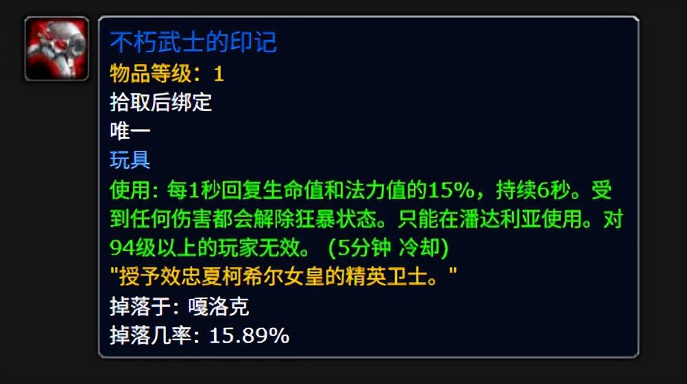 由欧姆尼斯-格林洛克掉落。有趣的饰品,杀怪多掉钱,仅限有经验的怪,CD长达10分钟。