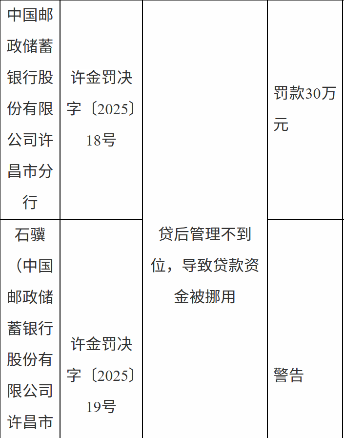 11月24日,国家金融监督管理总局许昌监管分局行政处罚信息公示表显示,中国邮政储蓄银行股份有限公司许昌市分行因贷后管理不到位,导致贷款资金被挪用被罚款30万元;石某被警告。