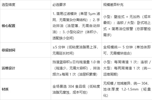 • 业态维度:直接影响「油污特性(粘度 / 凝固点)、残渣量、核心功能需求」(如火锅 “防凝加热”,轻食 “简易运维”)。
