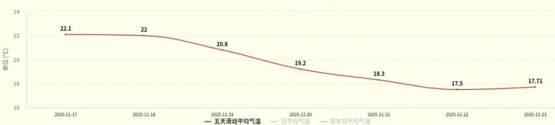 根据“珠海气象”微信公众号发布的消息,据气候季节划分标准(GB/T 42074-2022),我市受冷空气影响,11月18日达入秋标准(滑动5天平均气温序列连续5天小于22℃,则对应的逐日平均气温序列中第一个小于22℃的日期为入秋日),较常年入秋时间偏晚6天。