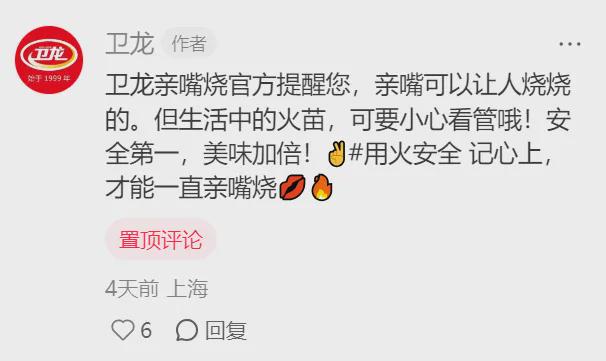 此外,卫龙还发起了一个亲嘴烧挑战:“别光自己亲,带上亲嘴烧!”