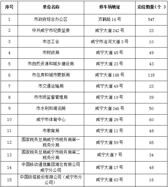 咸宁市主城区共计8826个停车位对外免费开放。其中:市政府综合办公区、市纪委监委机关、市财政局、市住房和城市更新局、市交通运输局、市总工会、市水利和湖泊局、市体育中心、市自然资源和城乡建设局、市市场监督管理局等咸宁大道沿线18家单位开放1234个停车位,市城发集团在主城区范围内开放7592个停车位(具体位置附后)。