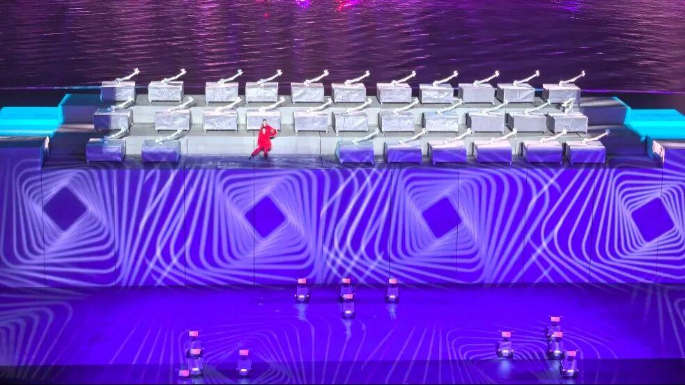本届全运会闭幕式最大的亮点是,第一次把闭幕式搬到滨海实景舞台,进行陆域看台与水域舞台的创新融合设计,形成海天一色的自然景观,是全球首个“城市全景闭幕式”。