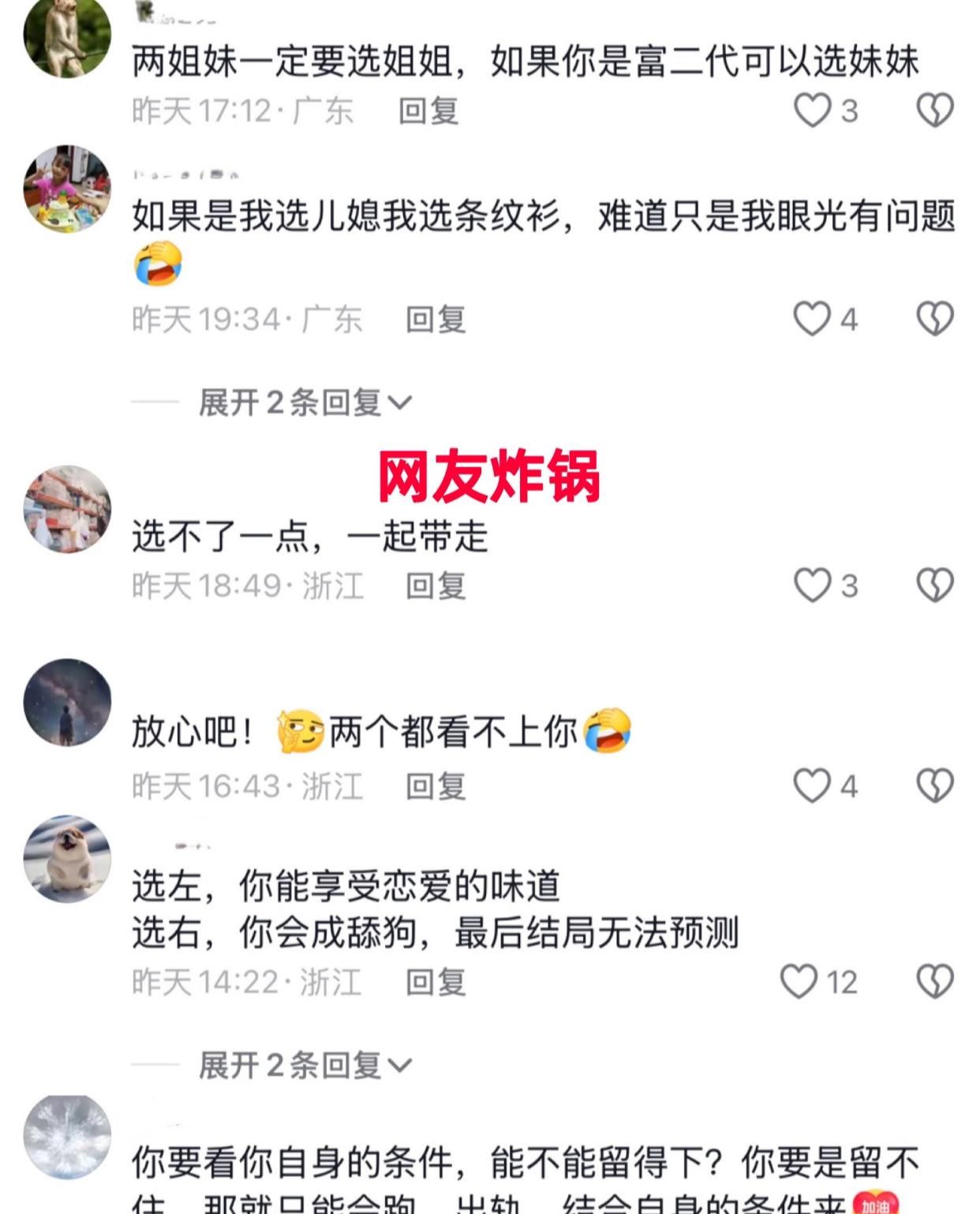 视频曝光,网友瞬间炸开锅,一个神评表示:“选妹妹,活泼可爱,你能谈上甜甜的恋爱;选姐姐,你会成舔狗,若驾驭不了,最后结局无法预料!”