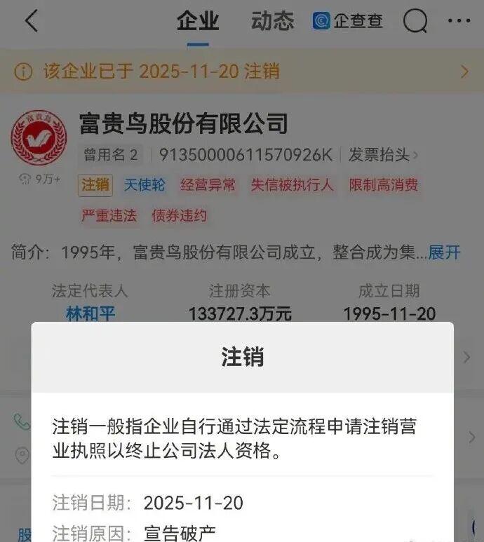11月24日消息,天眼查App显示,日前,富贵鸟股份有限公司(下称富贵鸟)登记状态由存续变更为注销,注销原因为宣告破产。