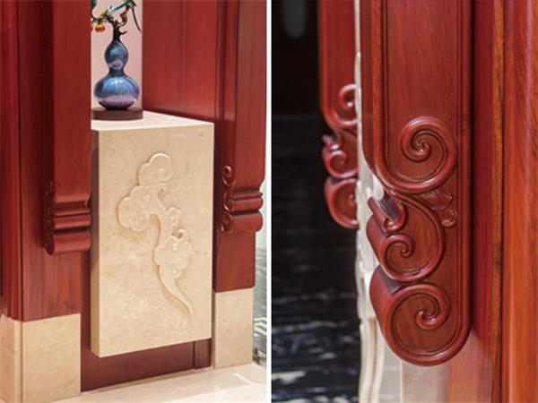 入口设计更是展现明清阁设计团队的匠心独具。针对门口较窄且厚的特殊情况,创新性地仿照飞罩形式设计出门框式挂落,上方为海棠式开光,下端雕刻卷云纹作结,与室内汉白玉方台侧面的高浮雕朵云纹相呼应,这一奇思妙想完美解决了传统与现代、美观与实用的平衡问题。