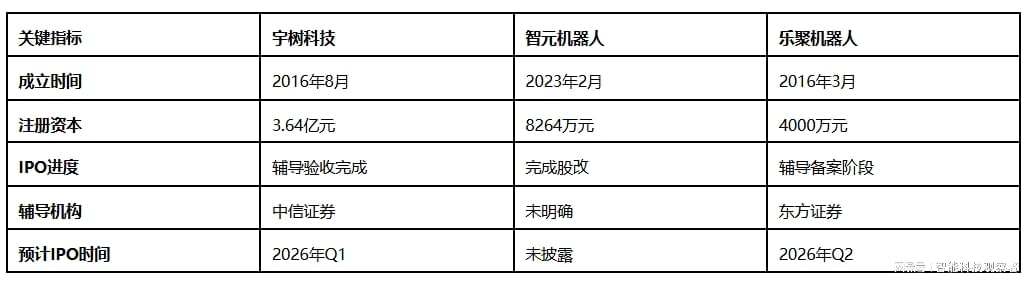 2025年以来,机器人赛道IPO进程明显加速,其中颇具代表性的是宇树科技、智元机器人与乐聚机器人。作为行业三大独角兽,这三家企业不仅是机器人赛道的现象级代表,更共同走到了资本化的最后冲刺阶段。