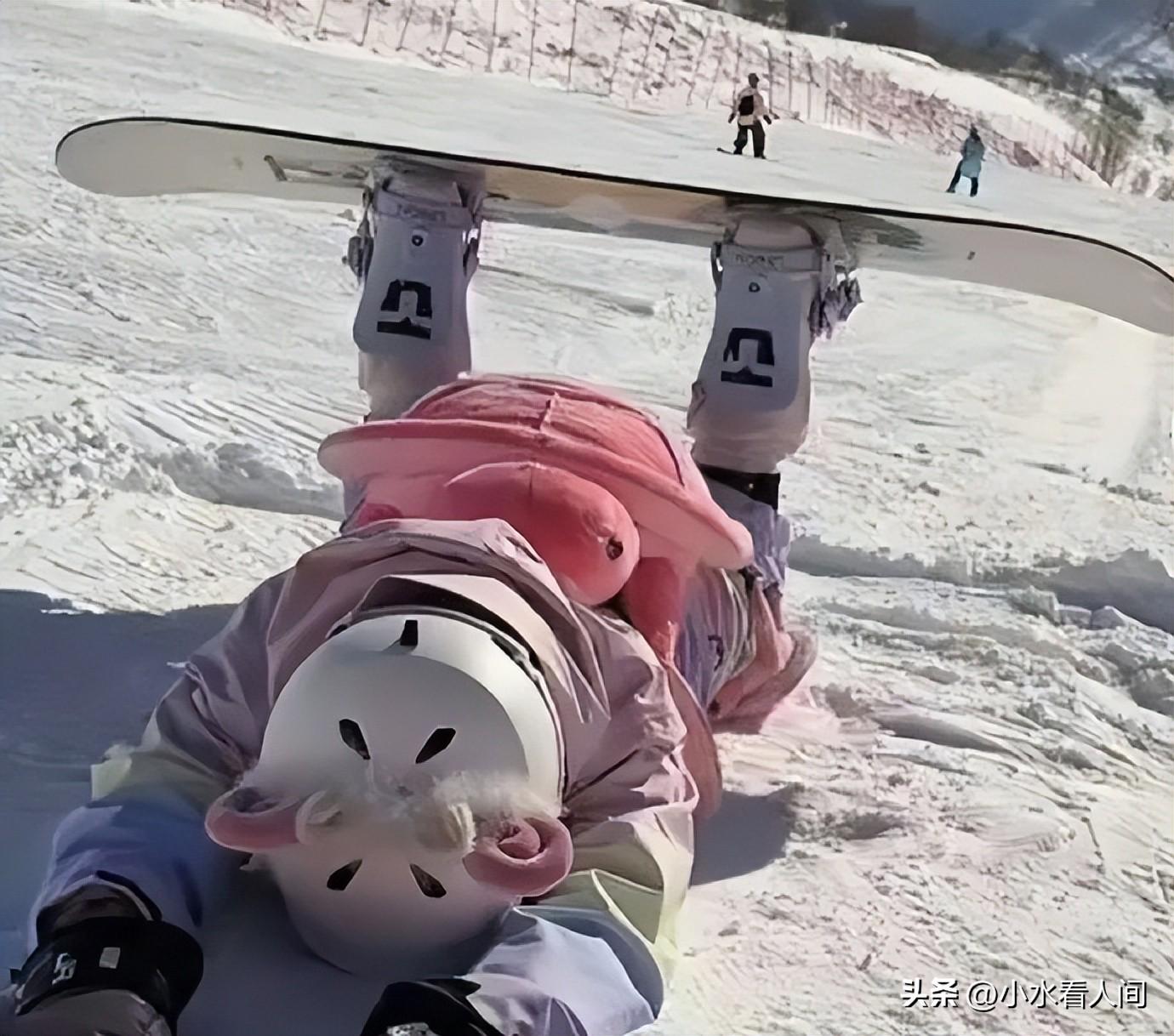 这是她第一次体验滑雪,尽管有专业的滑雪教练跟着,但还是摔了好几次。