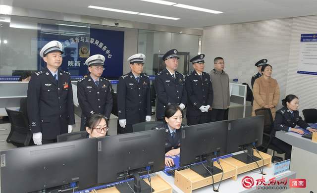 参加活动领导嘉宾观摩渭南市公安局交警支队车管所语音与互联网服务中心。记者 杨大君 摄