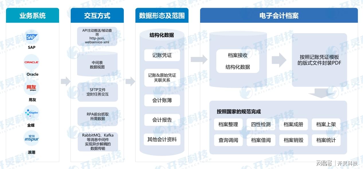 基于开灵科技电子会计方案的架构,SAP与该系统的集成通过“交互层-数据层-档案层”的分层链路,实现数据从业务系统到合规电子档案的全流程贯通: