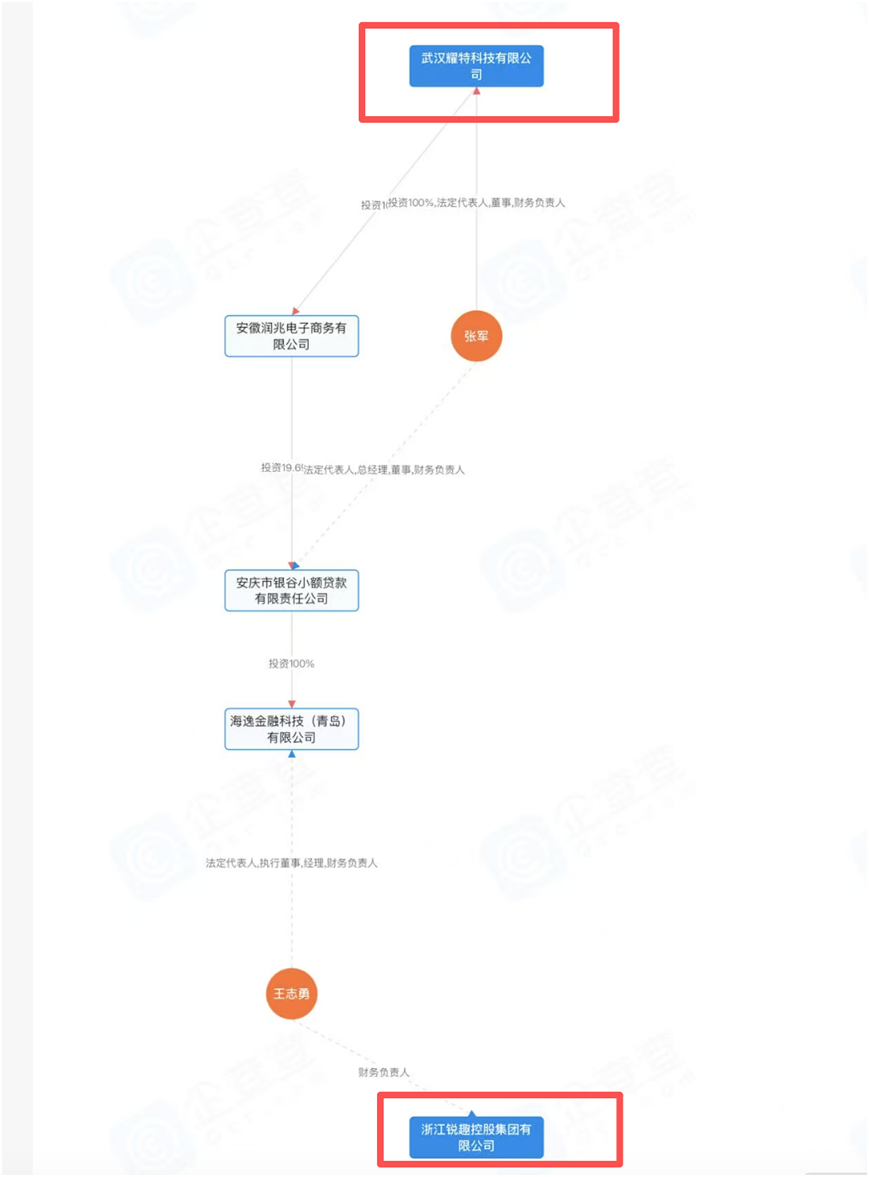 企查查信息显示,武汉耀特科技有限公司全资控股安徽润兆电子商务有限公司,后者持有安庆市银谷小额贷款有限公司19.69%的股份。