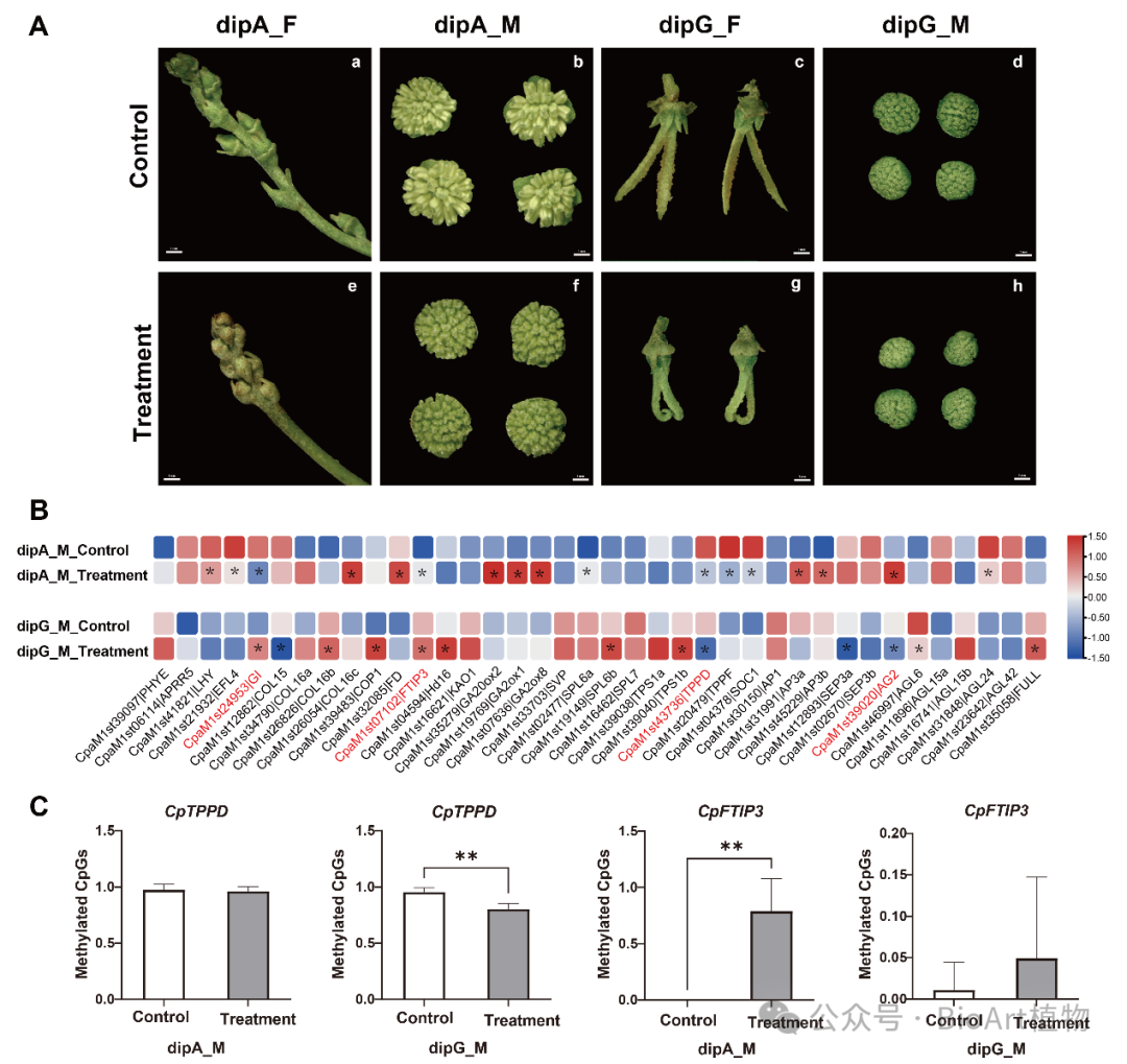 通过异源过表达拟南芥以及甲基化抑制剂5-氮杂胞苷(5-azaC)田间处理二倍体植株进行双重验证,发现CpHd16、CpTPPD和CpFTIP3基因的过表达均推迟了拟南芥的花期(图3)。而5-azaC处理不仅延缓了青钱柳雌雄花的发育进程,还改变了CpTPPD和CpFTIP3的甲基化状态与表达水平(图4),推测这些基因可能通过甲基化调控介导了青钱柳的开花过程。