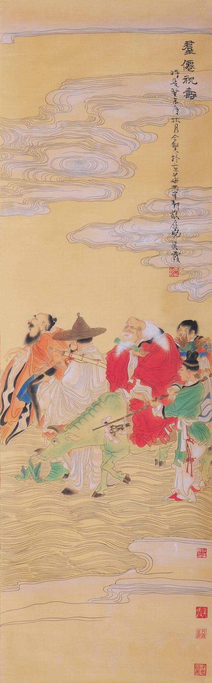 这幅《群仙祝寿图》相比于一般的作品有很多不同之处,可谓独具匠心。它一共描绘了神仙人物共赴王母的寿筵,表达仙灵境界的美好,完整的体现了任伯年超凡的想象力及超高的绘画水平,表现了他宽广、奇特的表现手法。